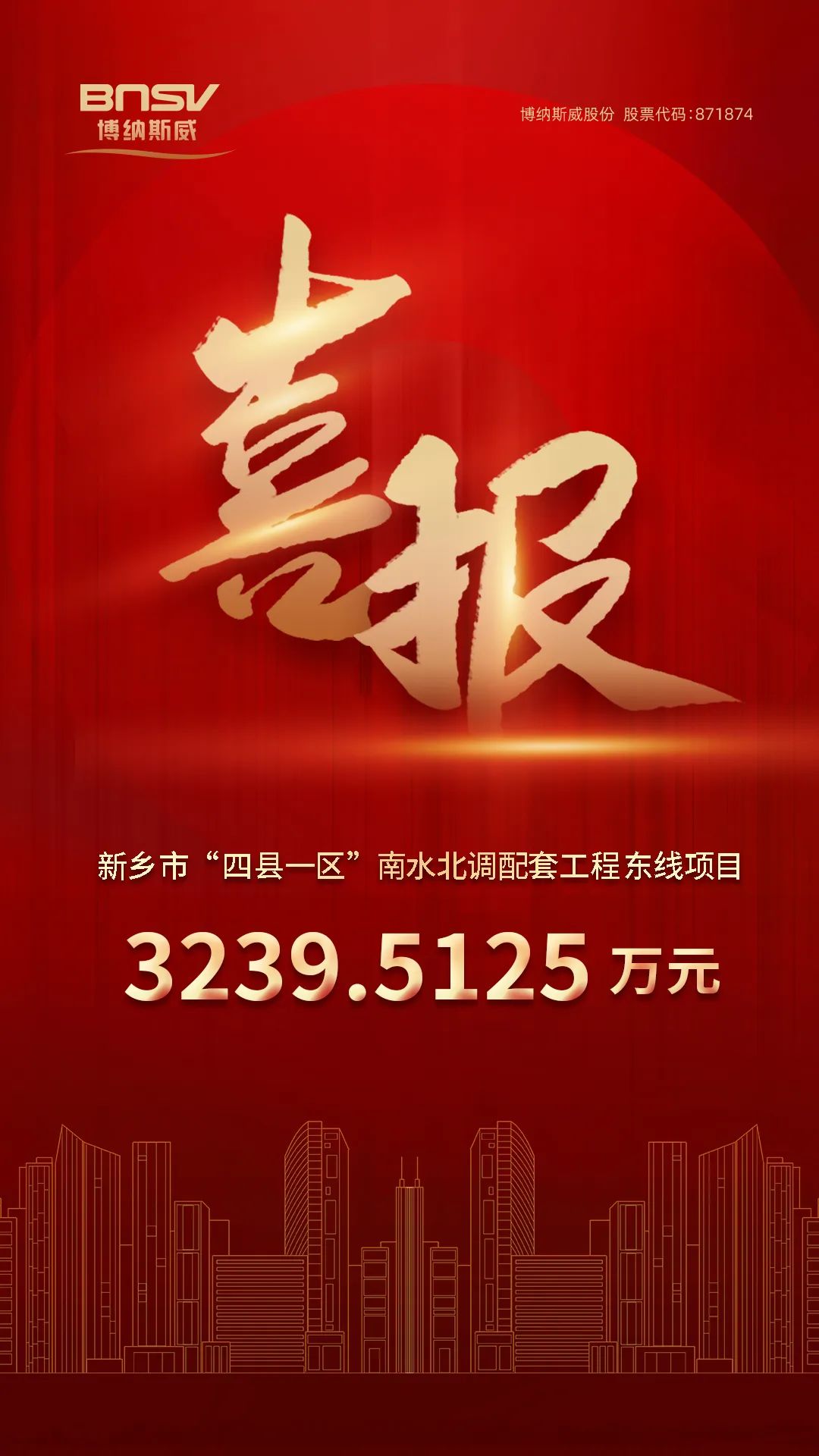 喜报!博纳斯威中标新乡市“四县一区”南水北调配套工程东线项目3239.5125万元