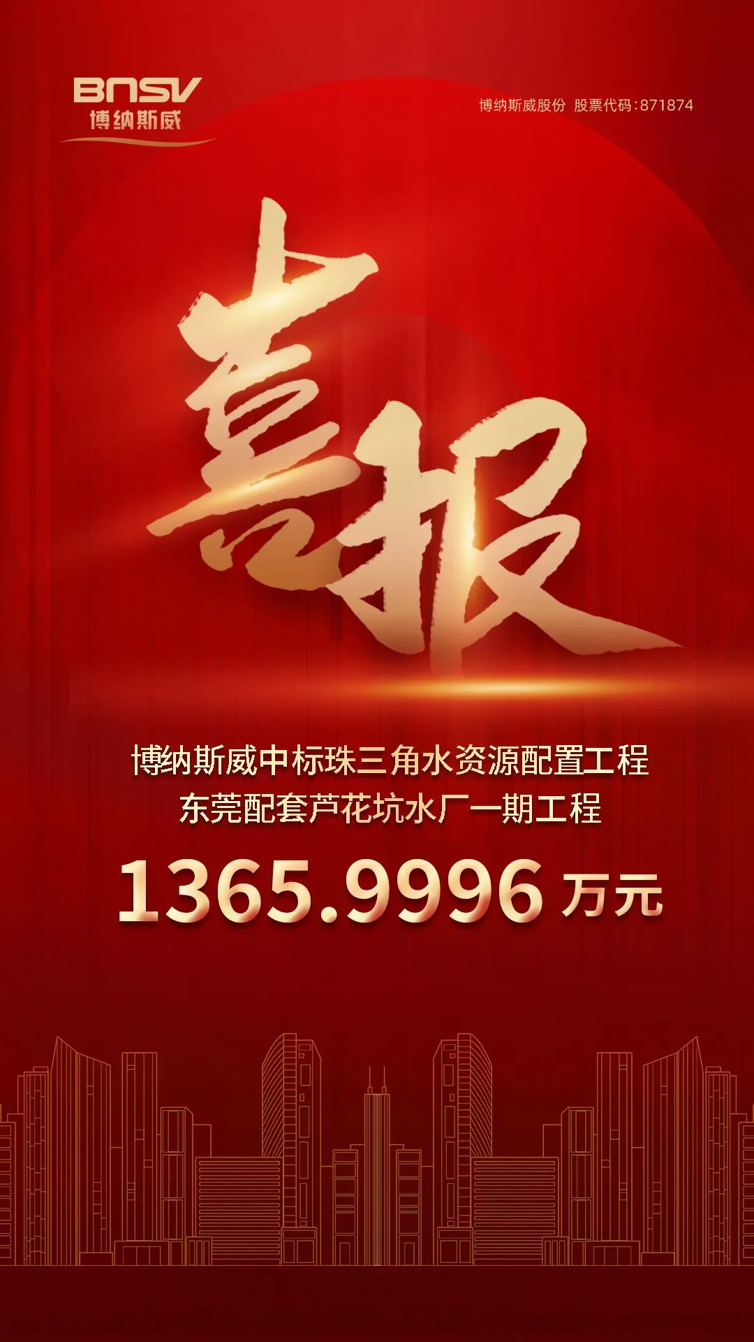 喜报!博纳斯威中标珠三角水资源配置工程东莞配套芦花坑水厂一期工程1365.9996万元