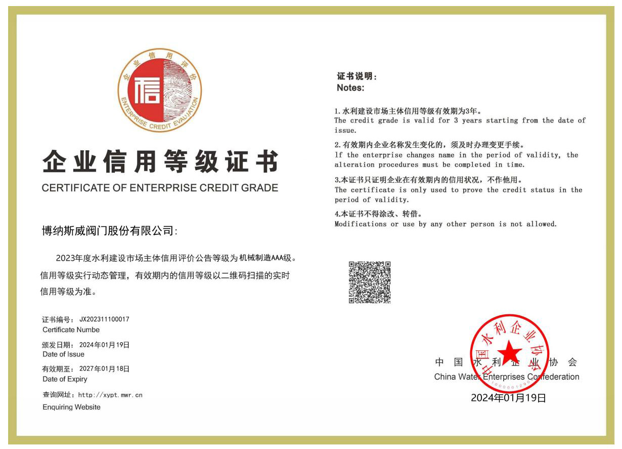 继2020年被水利部-中国水利企业协会评价为“机械制造AAA”信用企业之后,博纳斯威阀门股份有限公司在2023年度水利建设市场主体信用评价中再度被评为“机械制造AAA级”,这说明公司具有一贯良好的经营信誉和企业品牌形象。