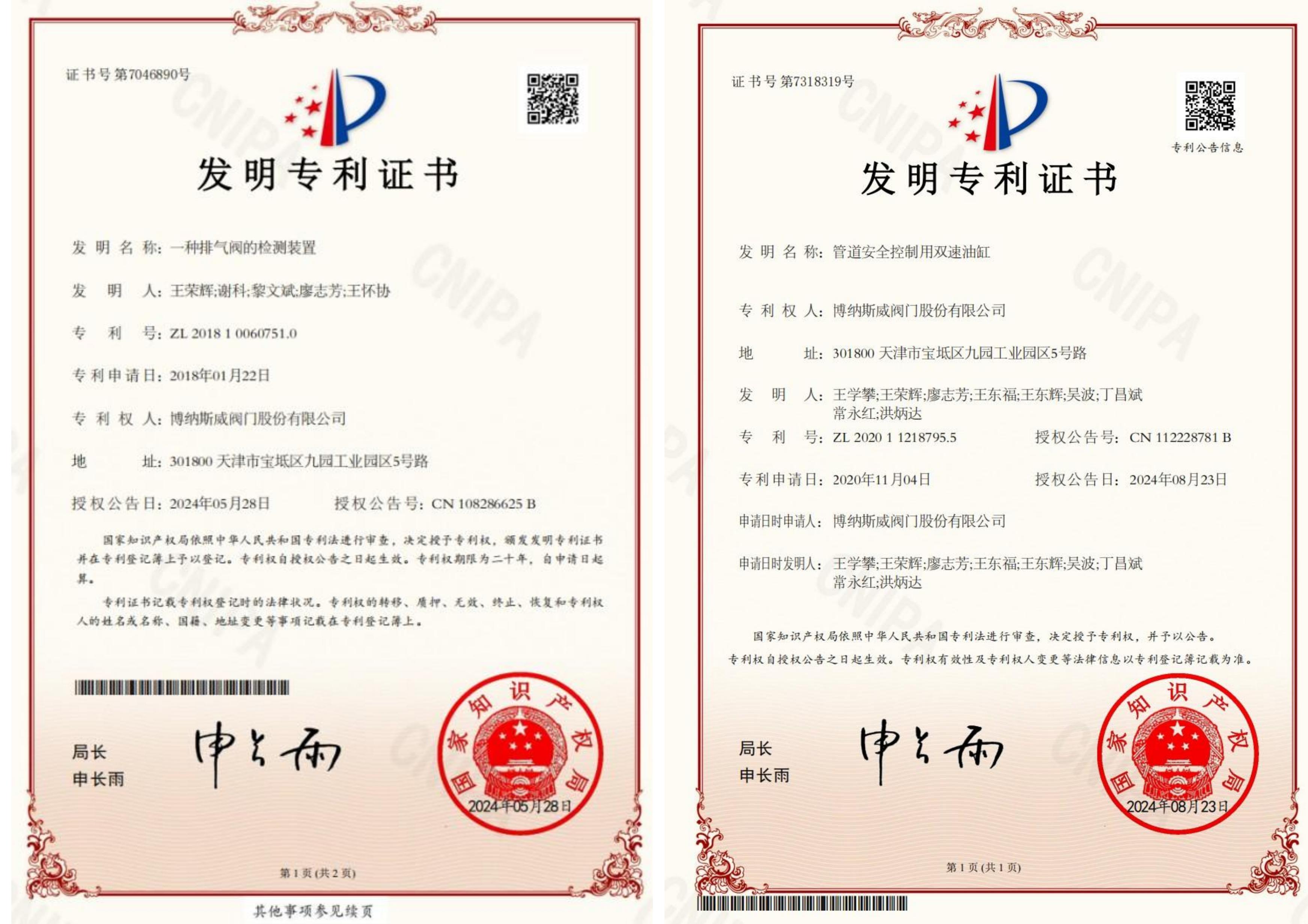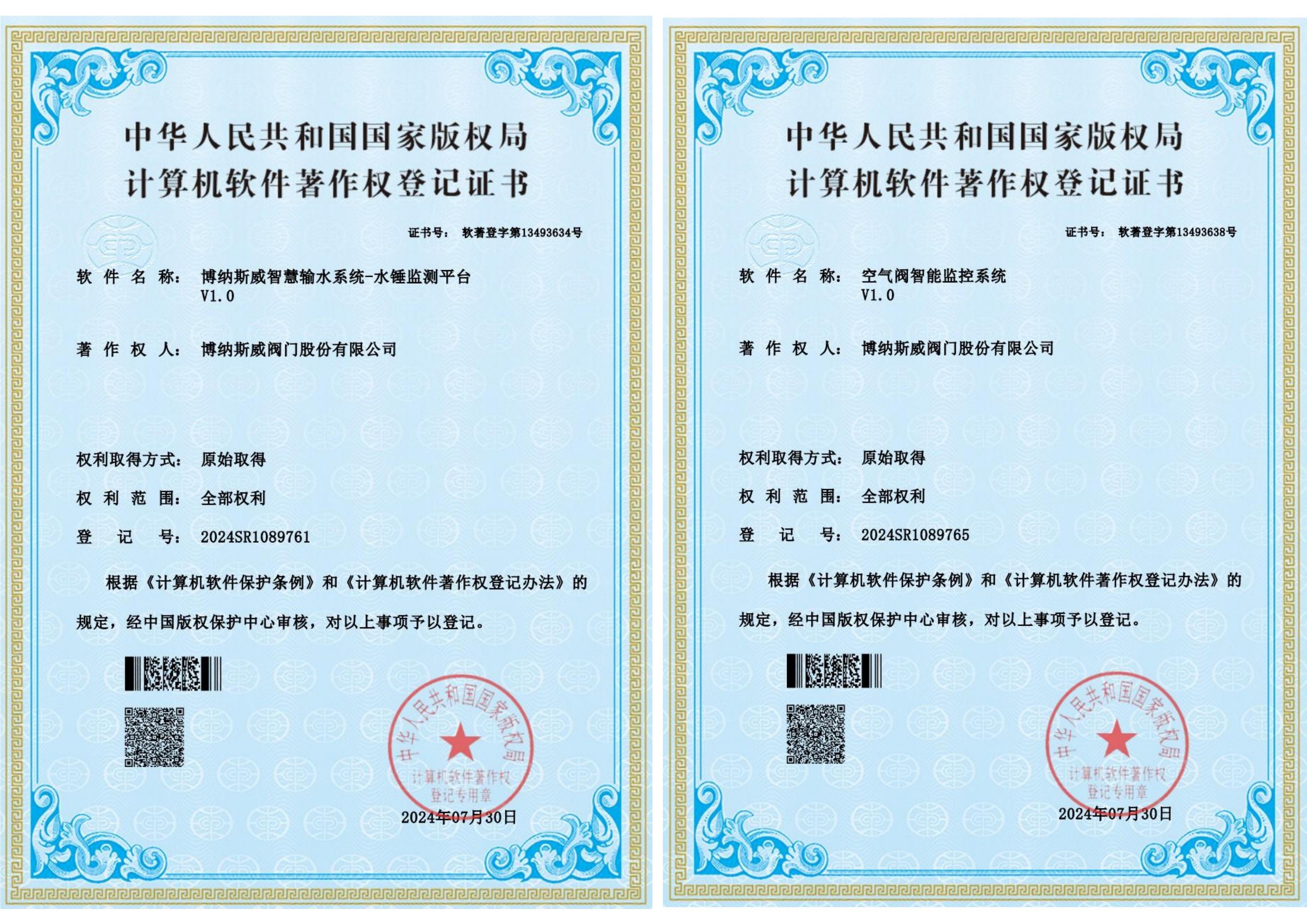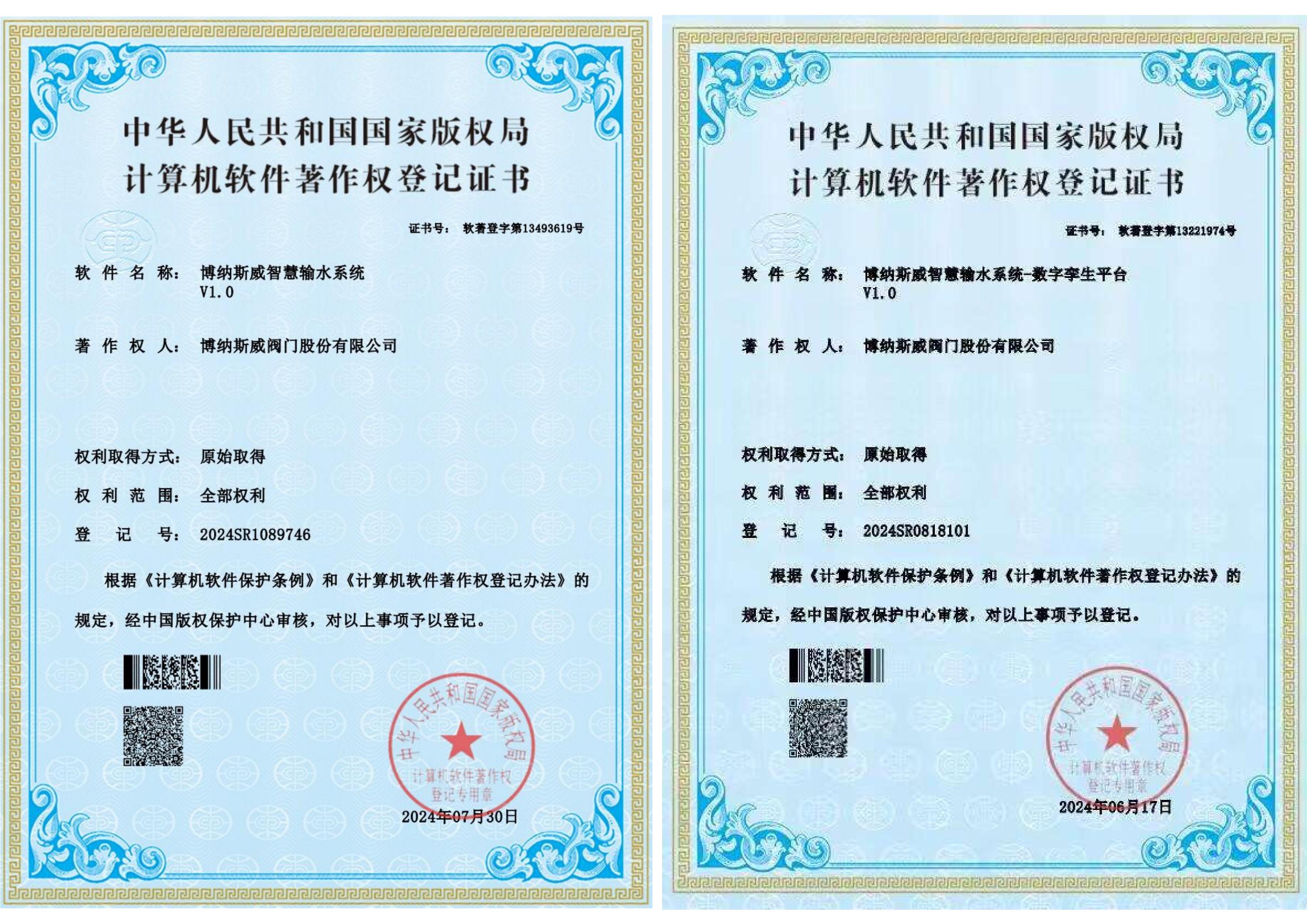 博纳斯威智慧输水系统-数字孪生平台、博纳斯威智慧输水系统、博纳斯威智慧输水系统-水锤监测平台、空气阀智能监控系统、智能调节阀控制系统五项新技术获得了国家版权局授权软件著作权。六项发明专利包括一种用于测量阀门进气量的检测装置、一种排气阀的检测装置、对冲消能轴流式环塞阀、一种液压传动双向密封轴流式截止阀、管道安全控制用双速油缸以及爆管保护安全装置。