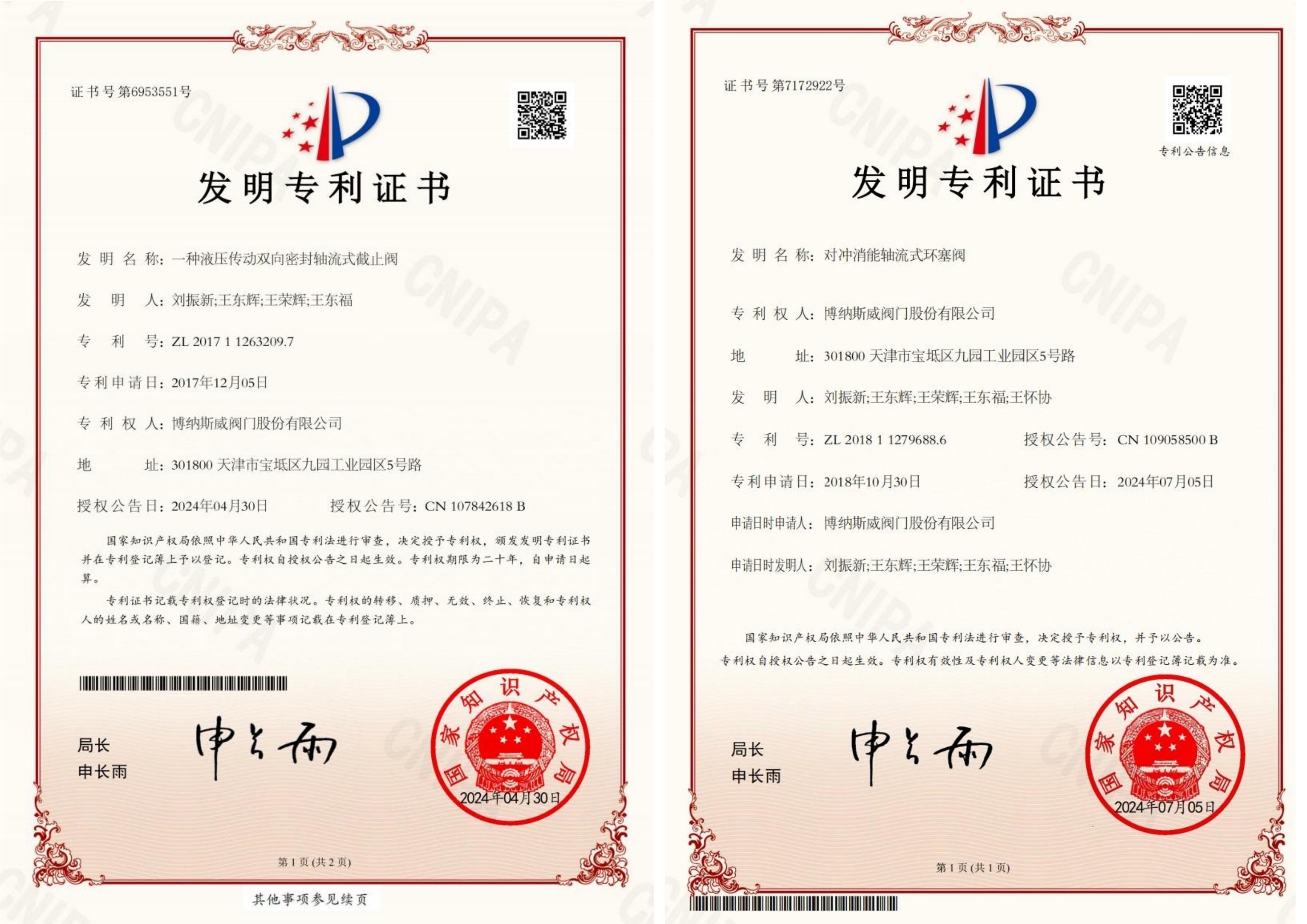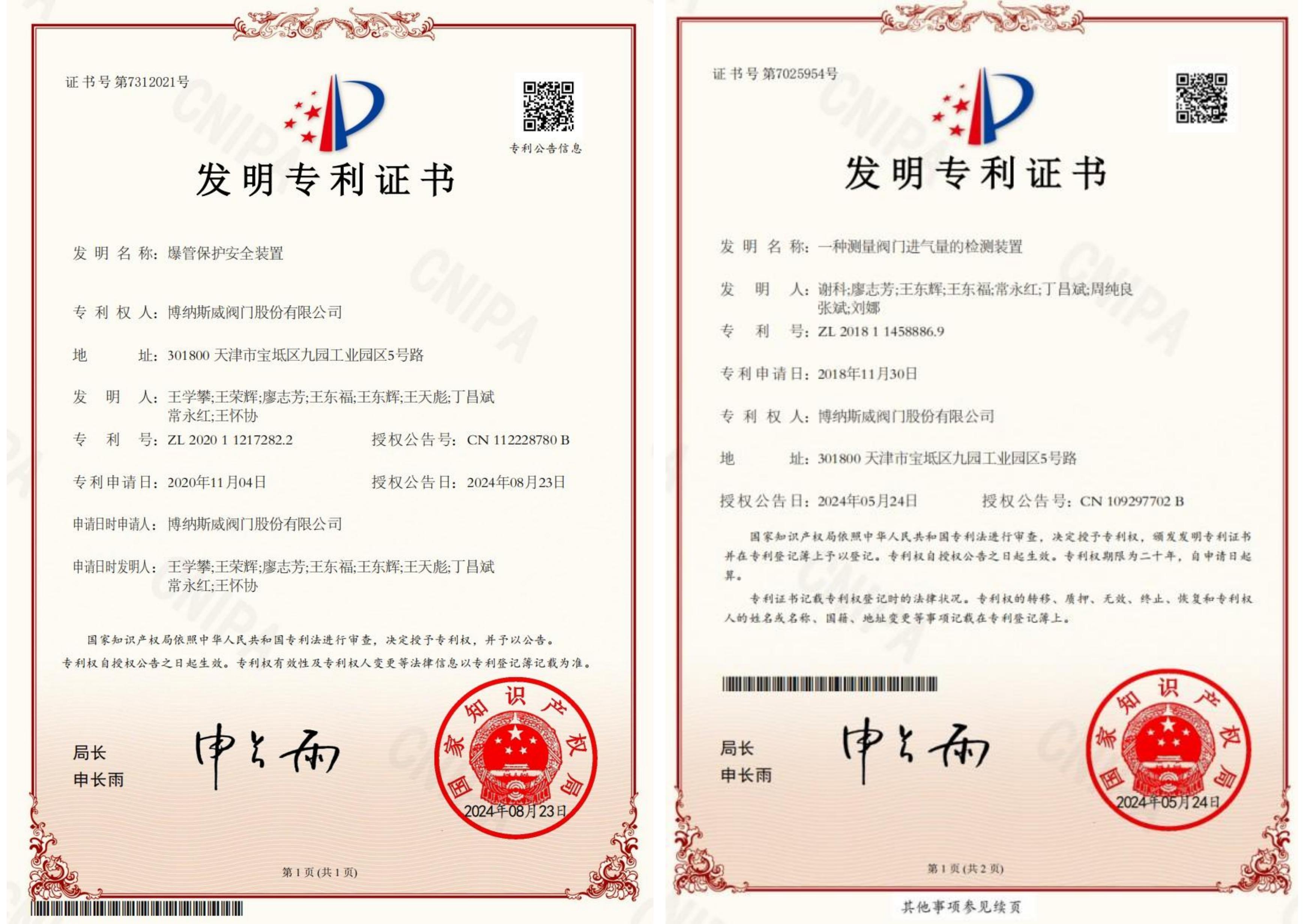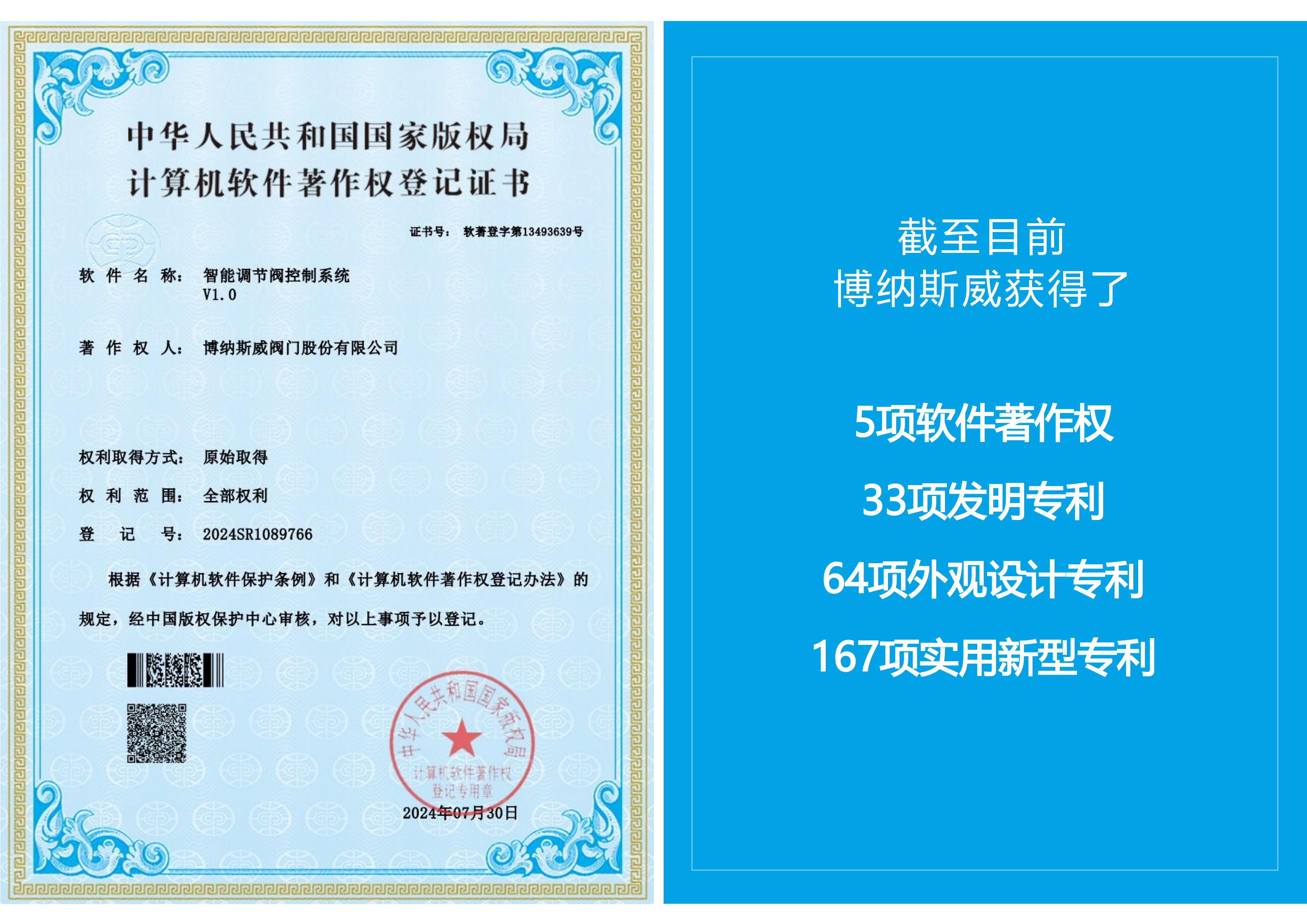 博纳斯威智慧输水系统-数字孪生平台、博纳斯威智慧输水系统、博纳斯威智慧输水系统-水锤监测平台、空气阀智能监控系统、智能调节阀控制系统五项新技术获得了国家版权局授权软件著作权。六项发明专利包括一种用于测量阀门进气量的检测装置、一种排气阀的检测装置、对冲消能轴流式环塞阀、一种液压传动双向密封轴流式截止阀、管道安全控制用双速油缸以及爆管保护安全装置。