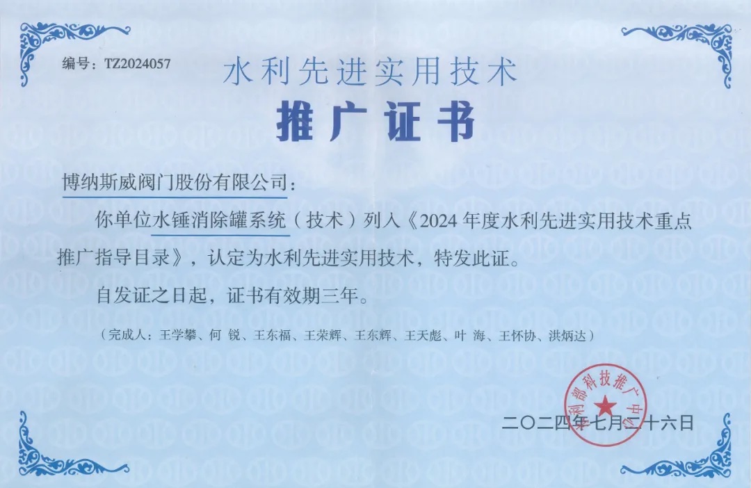 近日,水利部科技推广中心发布了《2024年度水利先进实用技术重点推广指导目录》,我公司申报的新型技术“水锤消除罐系统”,凭借科学的技术原理、先进的技术性能和良好的应用效益,通过水利部专家严格筛选,成功入选该目录。