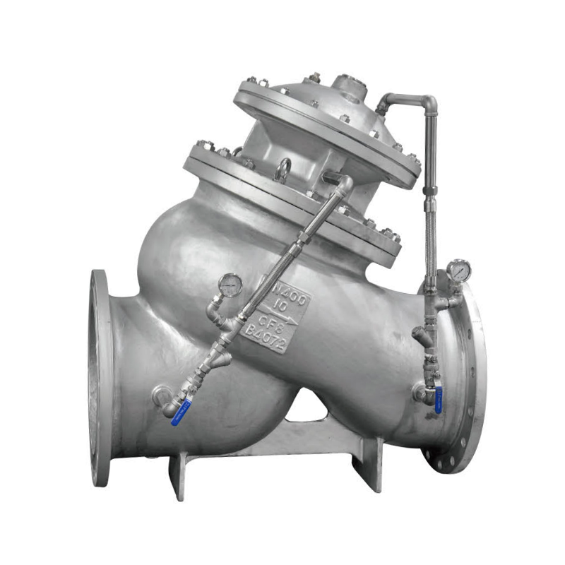 3、消除水锤和噪音:水泵停止运行时,主阀分两级关闭,主阀瓣先快速关90%,小阀瓣再缓慢关闭(关闭速度可根据现场工况进行调节),从而消除了水锤和噪音。