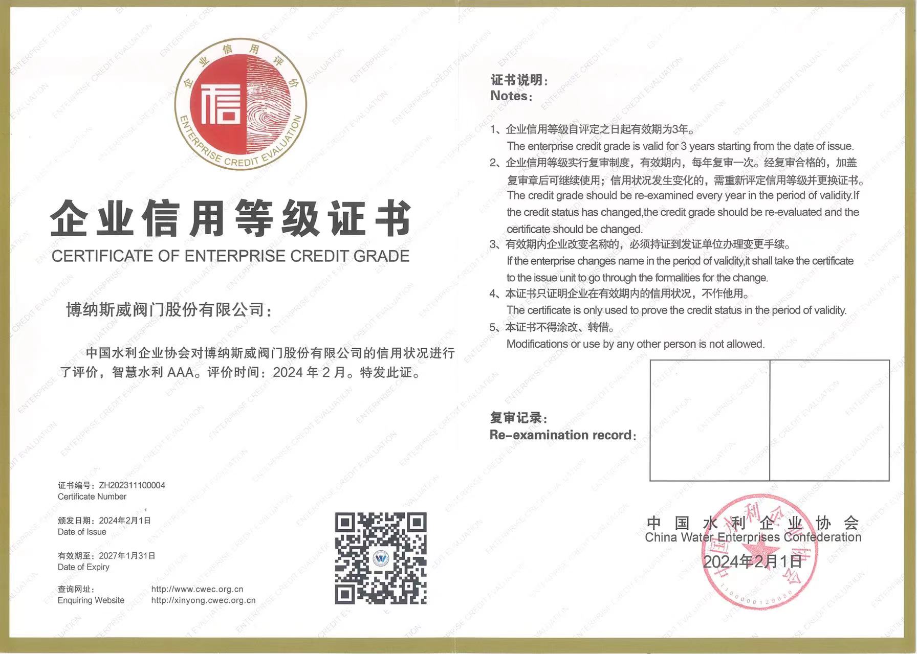 2024年2月1日,中国水利企业协会公布了2023年度智慧水利企业信用评价结果,博纳斯威阀门股份有限公司凭借过硬的综合实力、良好的品牌形象和社会信用,成功获得“智慧水利企业AAA级”(最高级)信用评价。这是继2022年被评价为“节水与水处理AAA”信用企业、2023年被评价为“机械制造AAA”信用企业后的又一有力肯定。