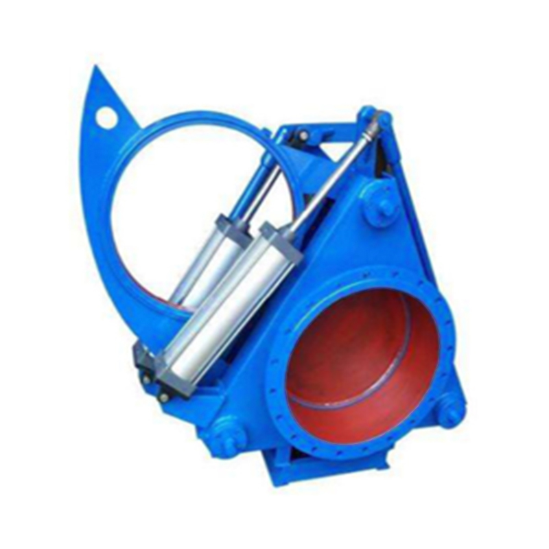 主要由左阀体、右阀体、丝杆、闸板、密封圈、杠杆、汽缸等零件组成,并由底座、支撑柱构成一个刚性结构体。阀门中设有夹紧、松开汽缸和翻板汽缸,夹紧、松开汽缸通过杠杆和丝杆螺旋驱动左、右阀体完成松开、夹紧动作,翻板汽缸驱动闸板完成开关动作。橡胶密封圈镶钳在闸板上,具有耐高温、密封性能好、更换方便、使用寿命长等特点。